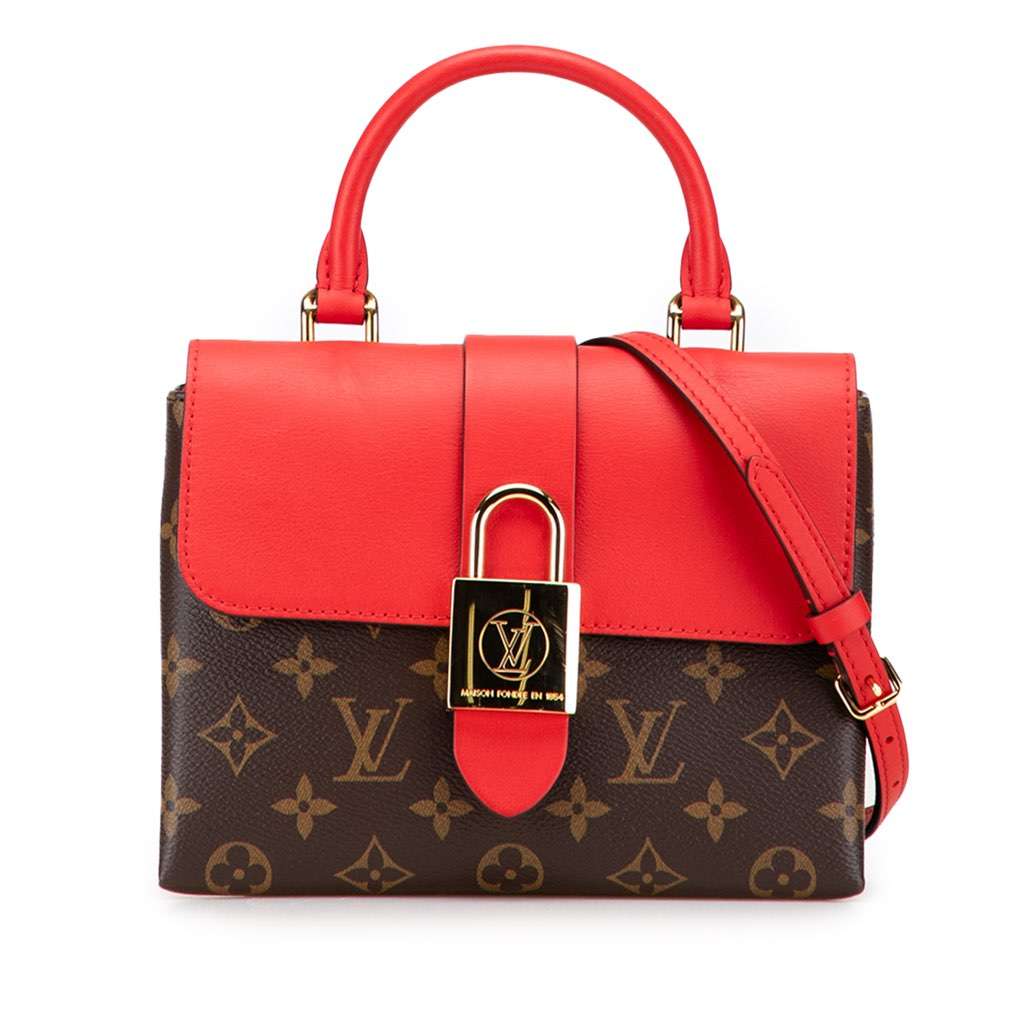 The Locky BB features a monogram canvas body, a rolled leather top handle, a detachable flat leather strap, a front leather flap with a padlock detail and magnetic snap closure, and an interior slip pocket.