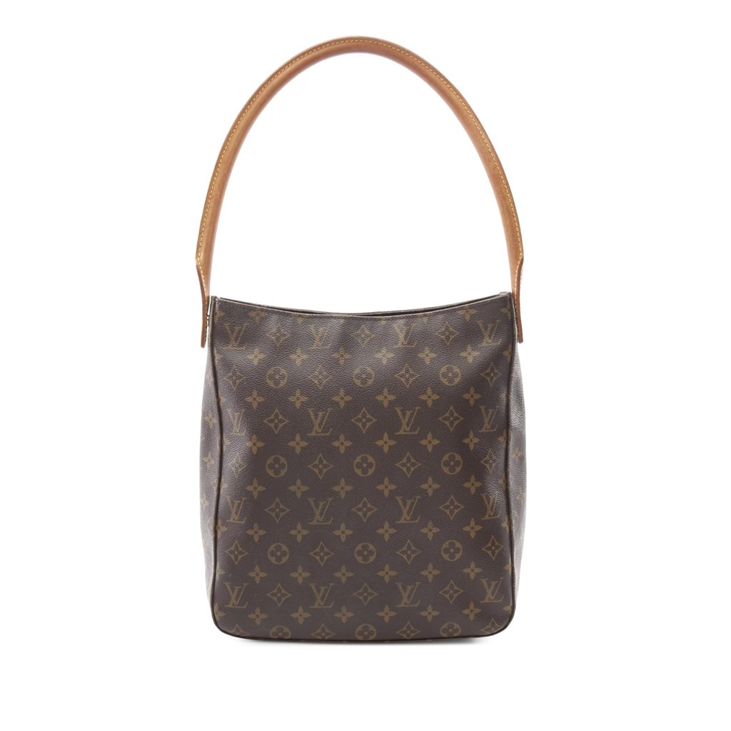 The Looping GM features a monogram canvas body, a rolled vachetta leather shoulder strap, a top zip closure, and interior zip and slip pockets.