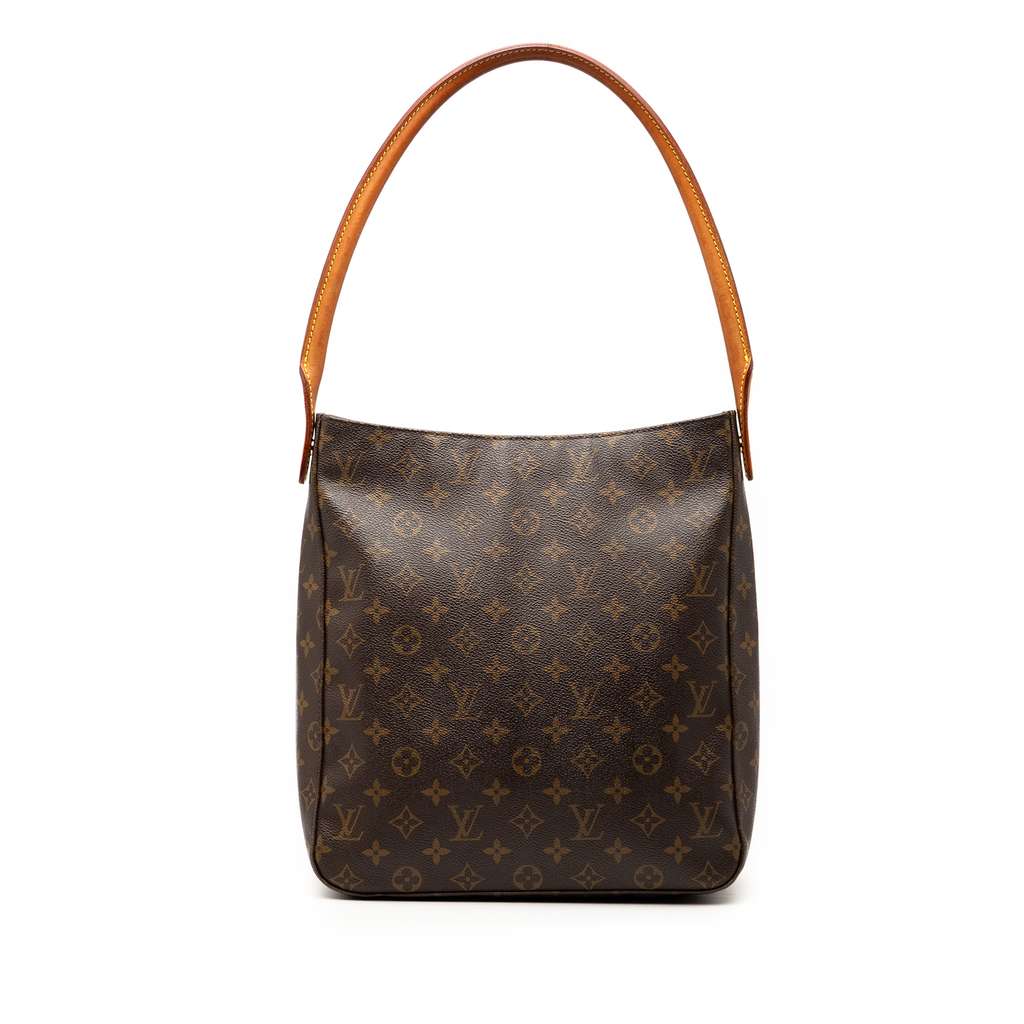 The Looping GM features a monogram canvas body, a rolled vachetta leather shoulder strap, a top zip closure, and interior zip and slip pockets.