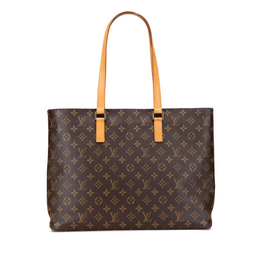 The Luco features a monogram canvas body, flat vachetta leather straps, a top zip closure, and interior zip and slip pockets.