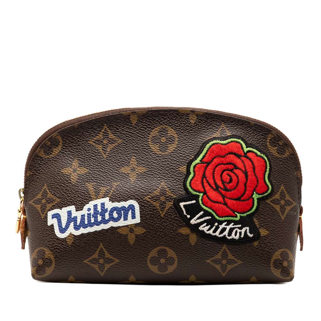 This cosmetic pouch features a printed monogram canvas body, a top zip closure, and an interior slip pocket.