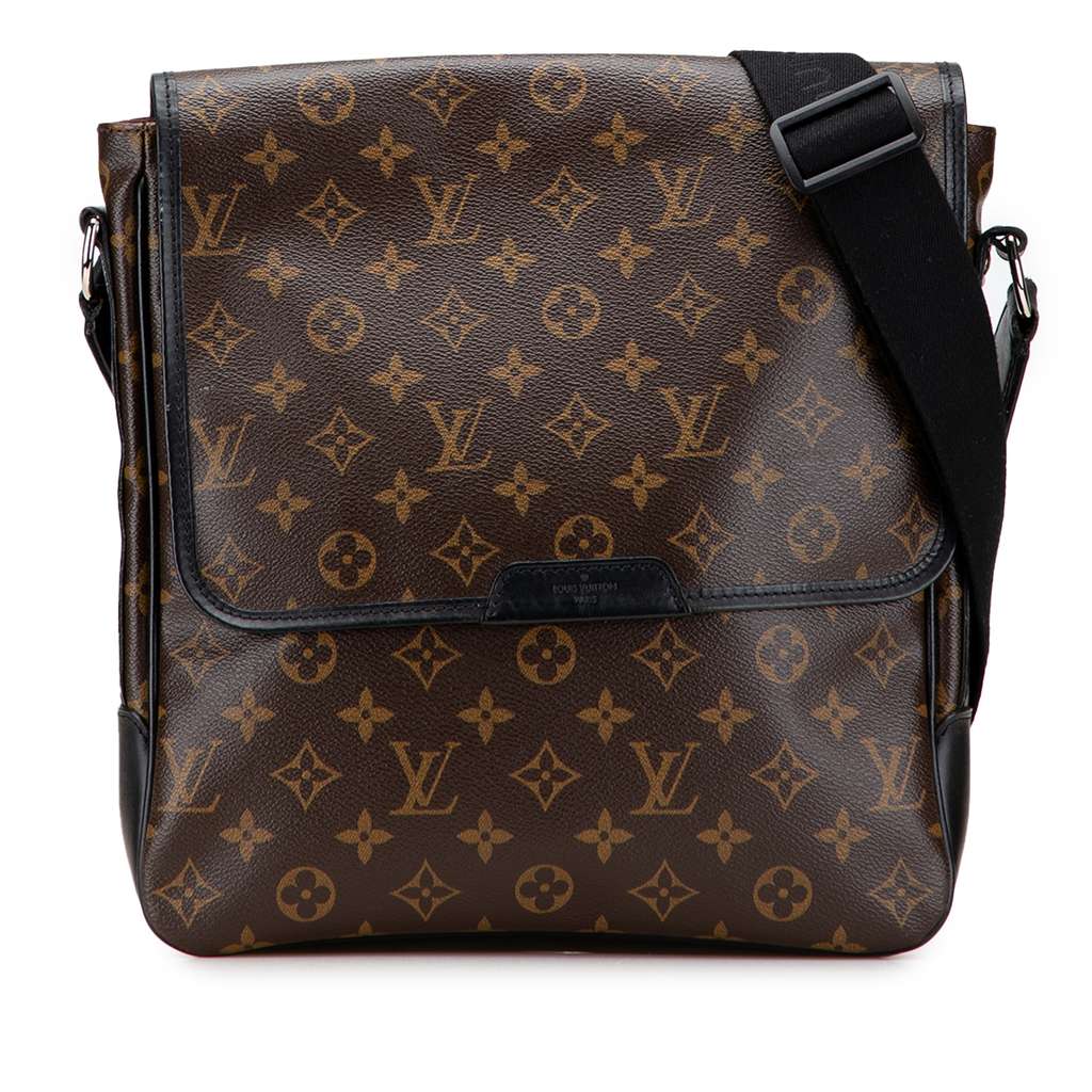 The Bass MM features a monogram macassar canvas body with leather trim, an adjustable flat strap, a top flap with magnetic closure, an exterior back zip pocket, and interior slip pockets.
