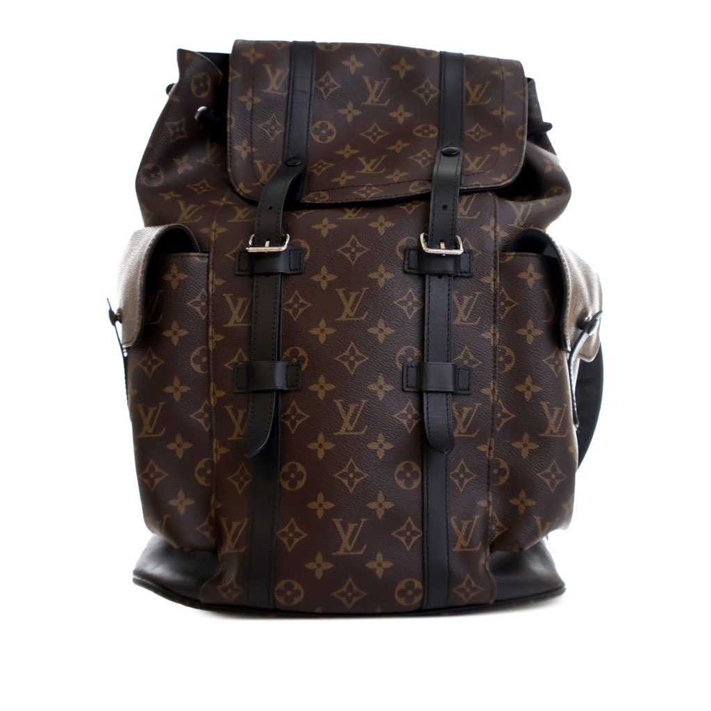 The Christopher Backpack MM features a monogram canvas body with leather trim, a flat top handle, adjustable back straps, a front flap with belt buckle and drawstring closure, exterior flap pockets, and interior zip and slip pockets.