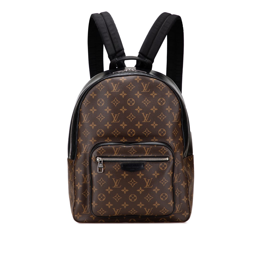 The Josh features a monogram macassar canvas body with leather trim, an exterior front zip pocket, a flat leather top handle, flat back straps, a top zip closure, an interior slip compartment, and interior slip pockets.
