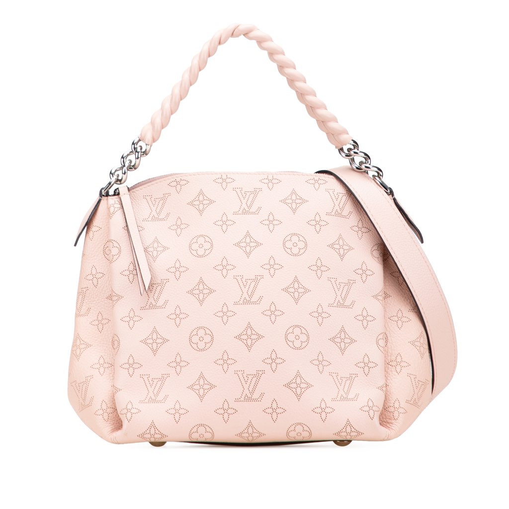 The Babylone BB features a monogram mahina leather body, a rolled leather handle, a detachable flat shoulder strap, a top zip closure, and an interior zip pocket.