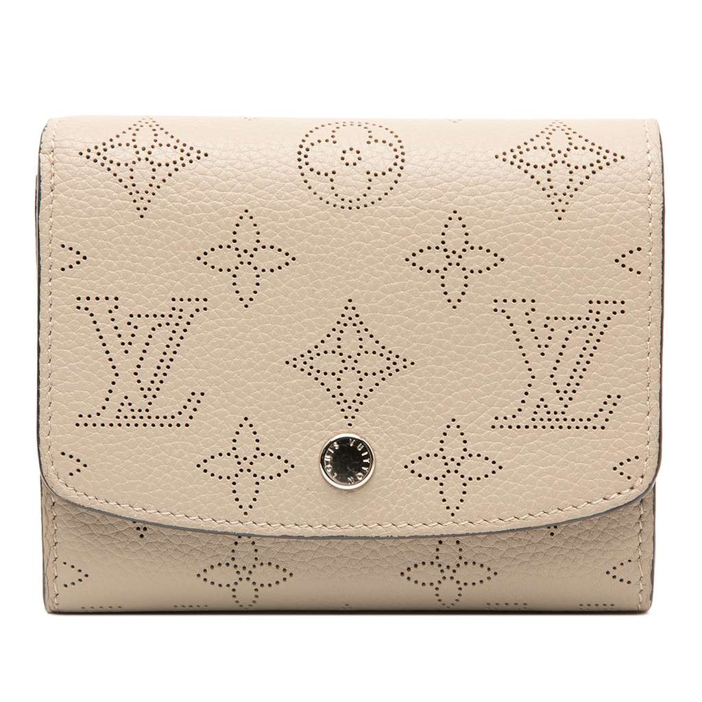 The Iris wallet features a monogram leather body, a top flap with snap closure, an interior zip compartment, and interior slip pockets.