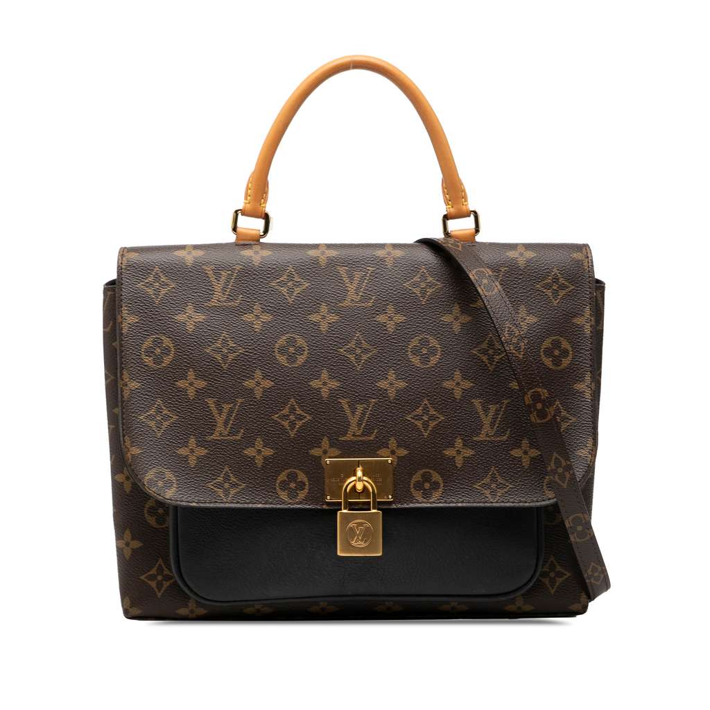 The Marignan features a monogram canvas body, a rolled vachetta leather top handle, a detachable flat monogram canvas shoulder strap, a front flap with magnetic snap button closure, and interior slip pockets.