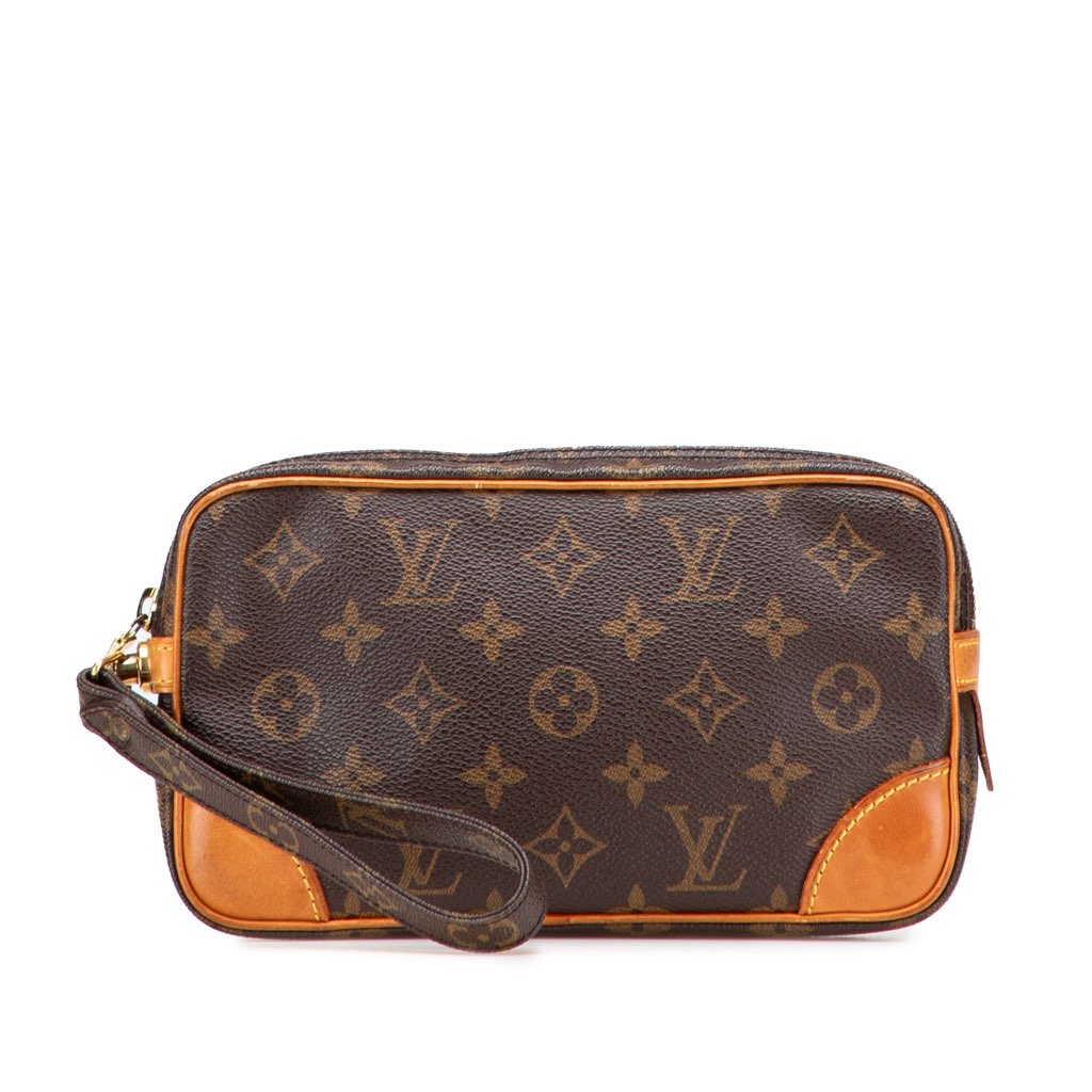 The Marly Dragonne PM features a monogram canvas body with vachetta leather trim, a flat wrist strap, and a top zip closure.