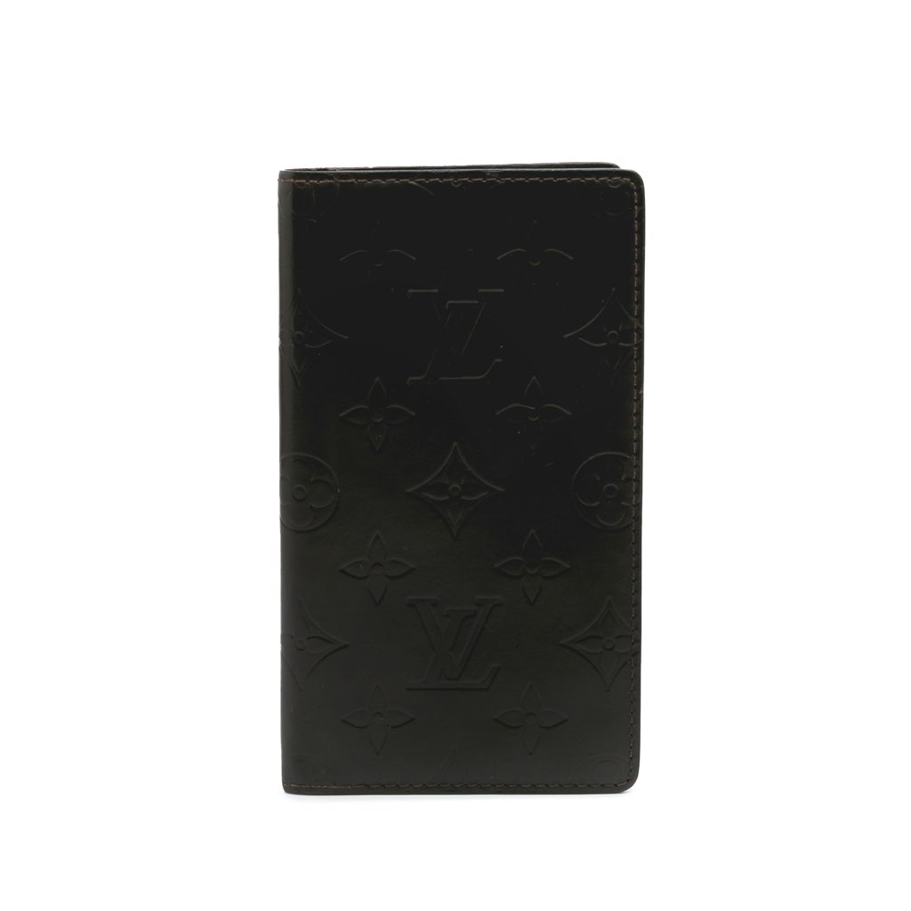 This long wallet features a monogram mat leather body and interior slip compartments.