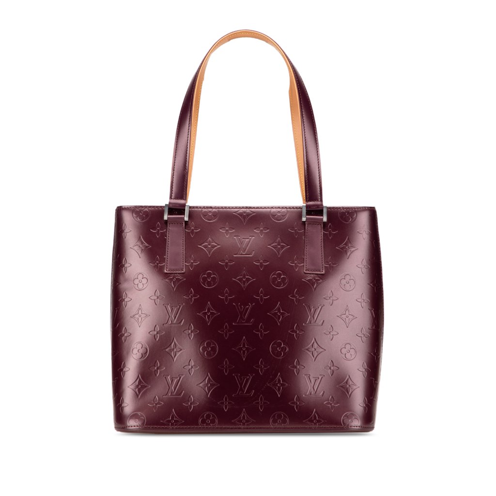 The Stockton features a monogram mat leather body, flat leather handles, a top zip closure, and an interior zip pocket