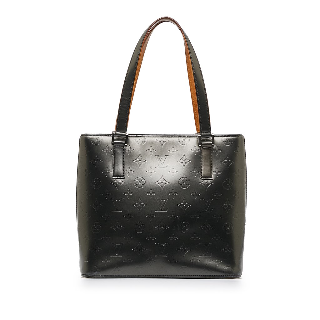 The Stockton features a monogram mat leather body, flat leather handles, a top zip closure, and an interior zip pocket.