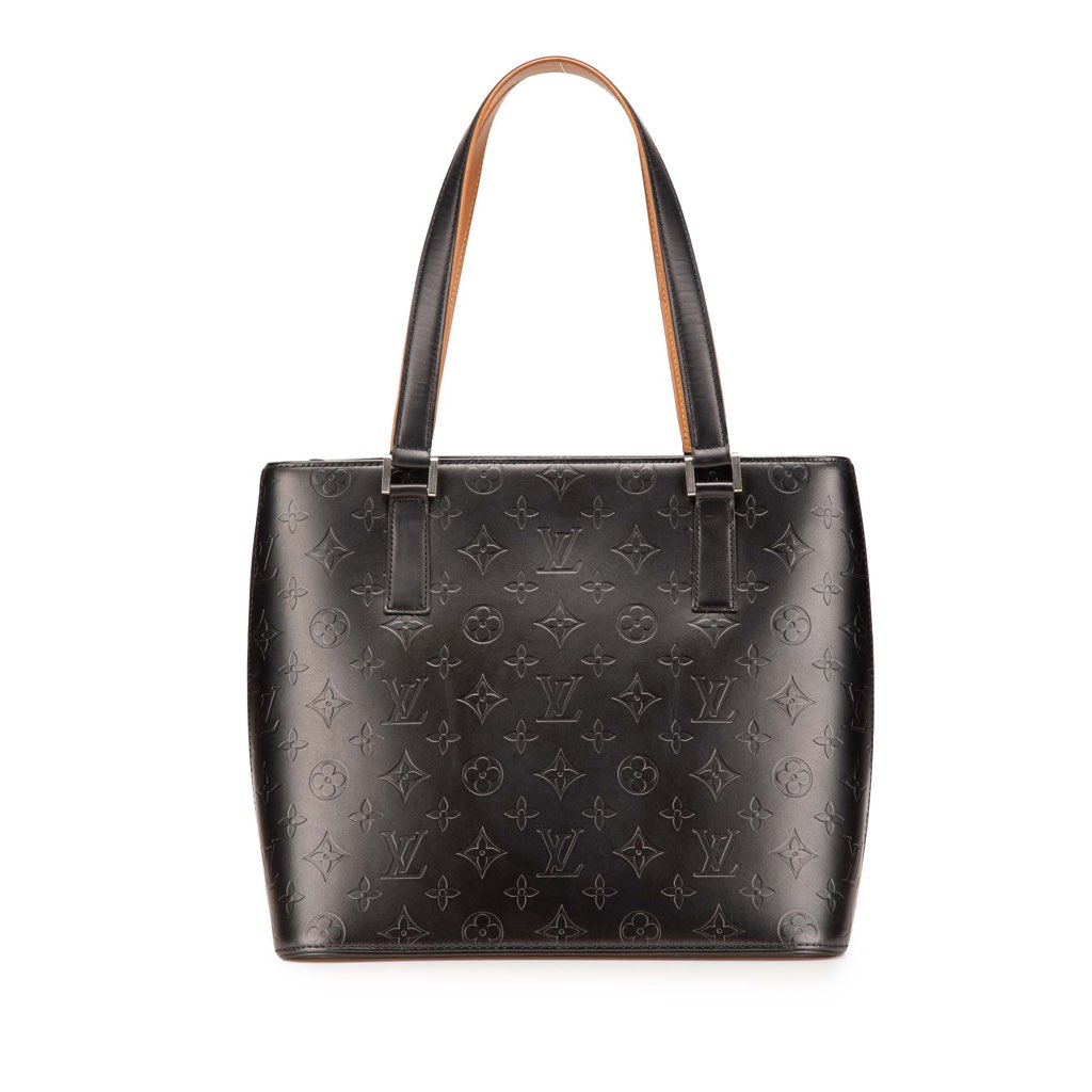 The Stockton features a monogram mat leather body, flat leather handles, a top zip closure, and interior zip and slip pockets.