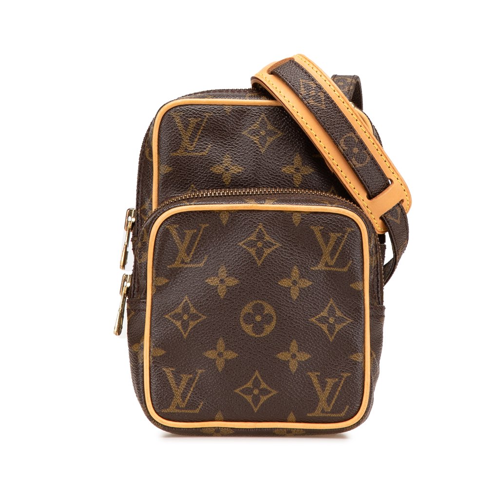 The Mini Amazone features a monogram canvas body with vachetta leather trim, an adjustable flat shoulder strap, a top zip closure, and an exterior front zip pocket.