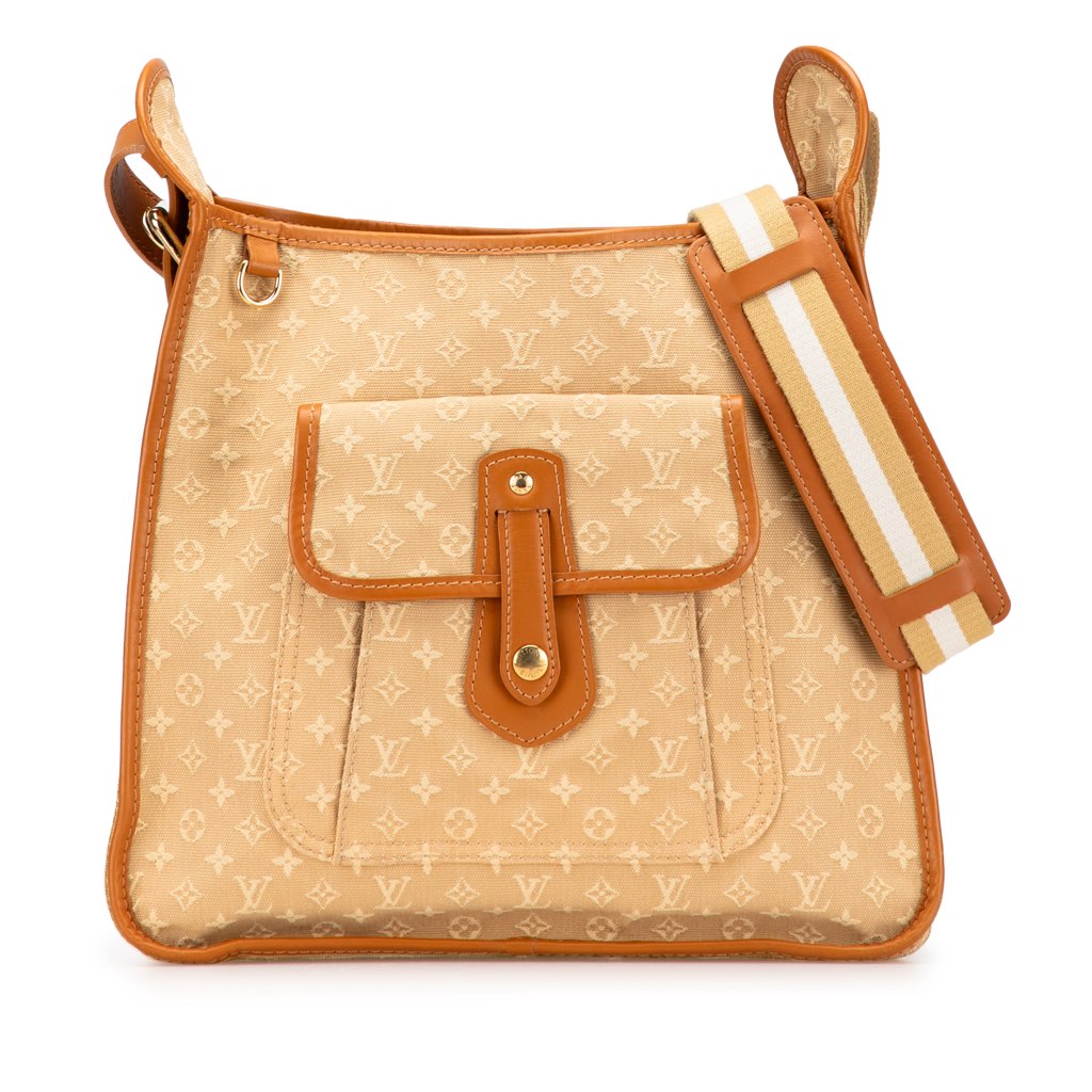 The Mary Kate features a mini lin canvas body with leather trim, a flat canvas strap with leather shoulder guard, an exterior flap pocket with a stud closure, an open top, and interior zip, slip and open pockets.