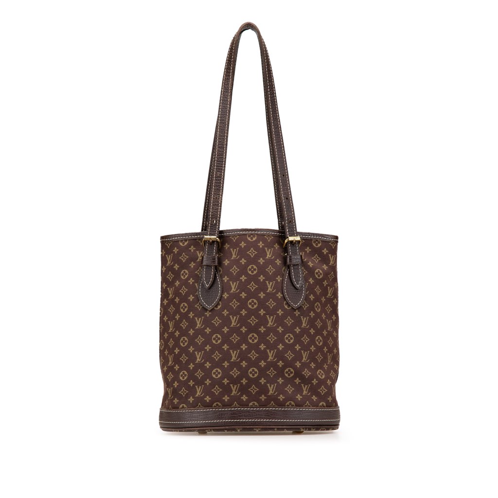 This Bucket PM features a monogram mini lin body with leather trim, flat leather straps, an open top, and interior zip and slip pockets.
