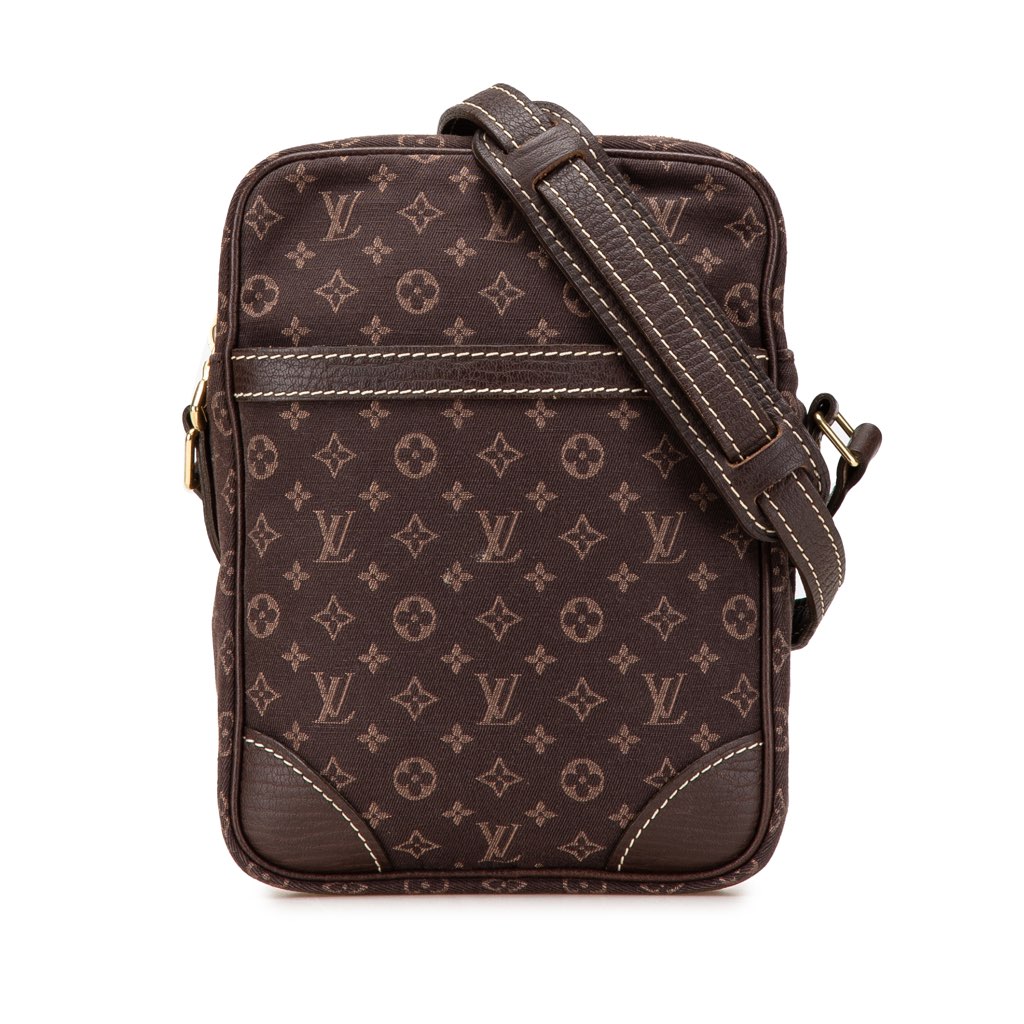 The Danube features a monogram mini lin body with leather trim, an adjustable flat leather strap, a top zip closure, an exterior slip pocket, and an interior slip pocket.
