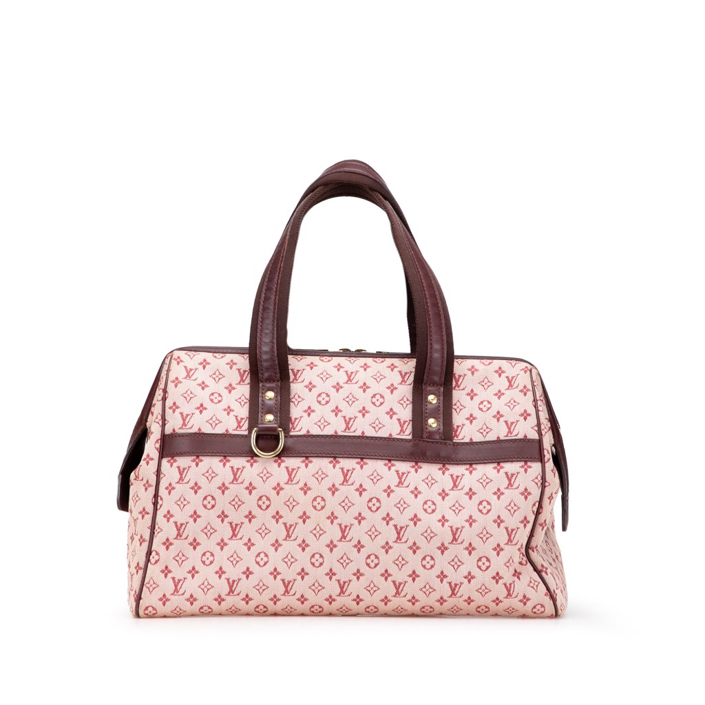 The Josephine GM features a monogram mini lin canvas body with leather trim, flat leather handles, a top zip closure, and interior zip, slip, and open pockets.