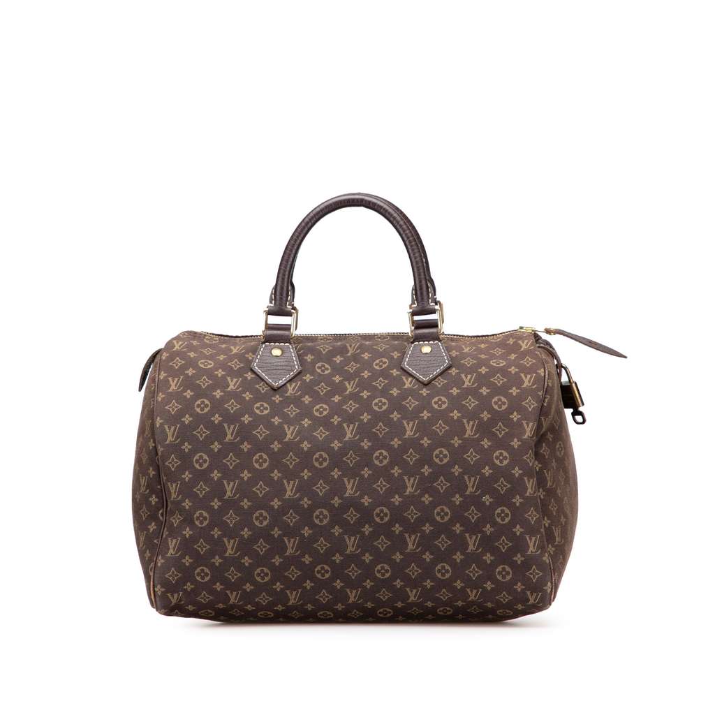 The Speedy 30 features a monogram mini lin canvas body, rolled leather handles, a top zip closure, and an interior slip pocket.