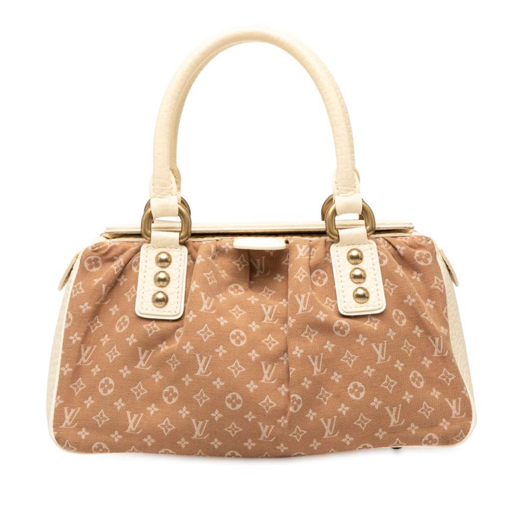 The Trapeze PM features a mini lin canvas body with leather trim, rolled leather top handles, a fold-over top with magnetic snap closures, and an interior slip pocket.