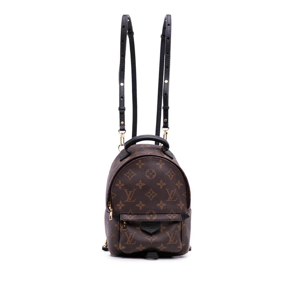 The Mini Palm Springs features a monogram canvas body, adjustable flat leather back straps, a rolled leather top handle, an exterior front zip pocket, a top zip closure, and an interior slip pocket.