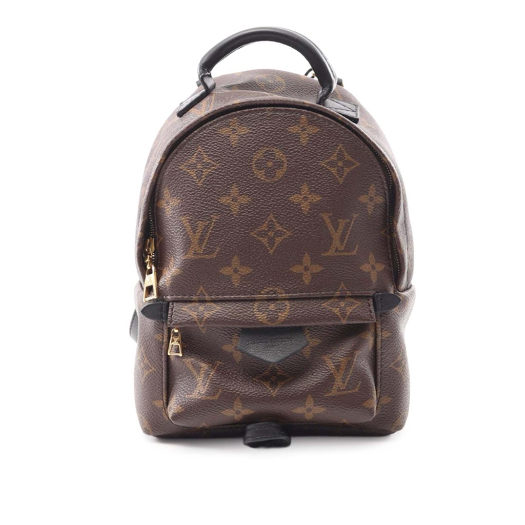 The Mini Palm Springs features a monogram canvas body, a flat top handle, adjustable flat leather back straps, a top zip closure, an exterior front zip pocket, and an interior slip pocket.