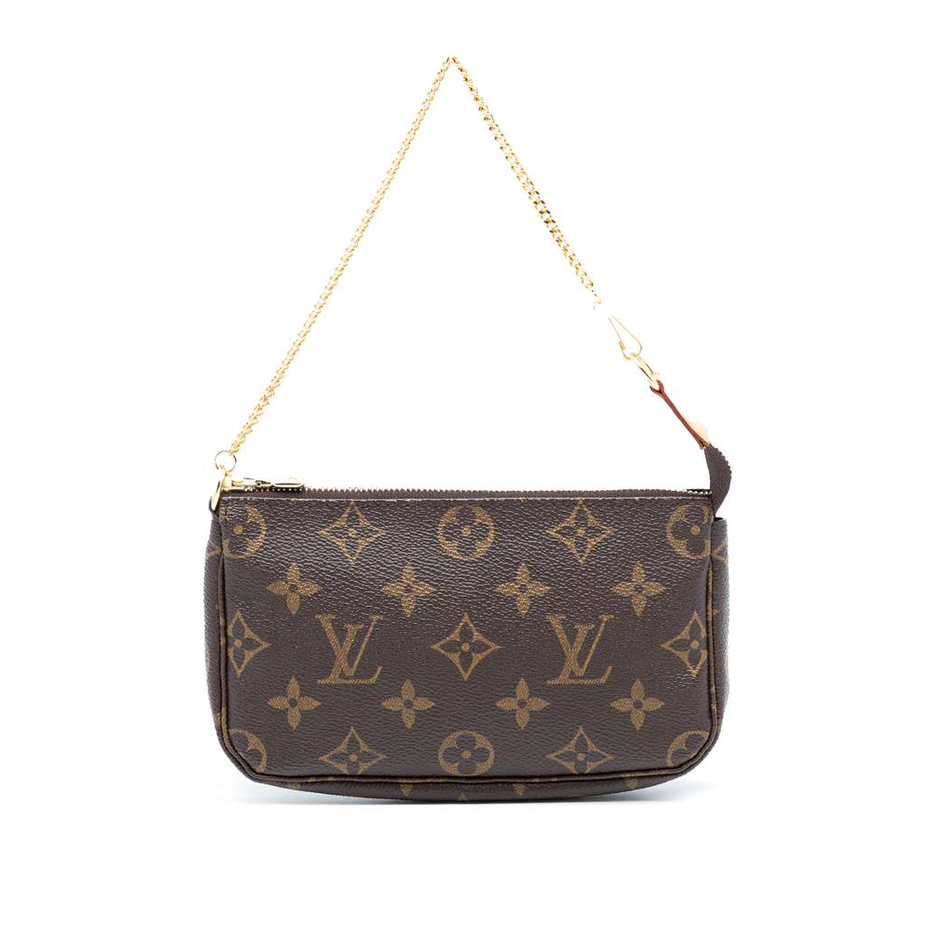 The Mini Pochette Accessoires features a monogram canvas body, a chain link handle, and a top zip closure.