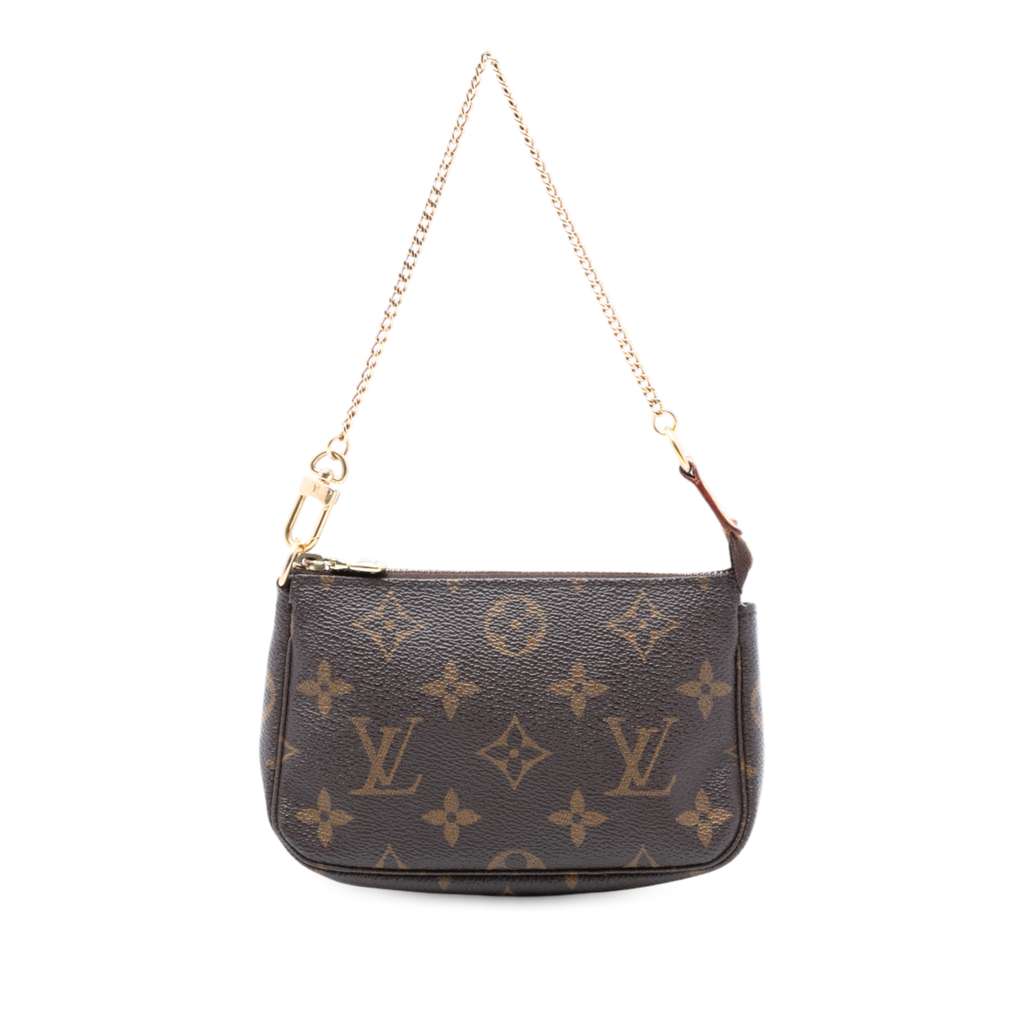 The Mini Pochette Accessoires features a monogram canvas body, a gold-tone chain strap, and a top zip closure.