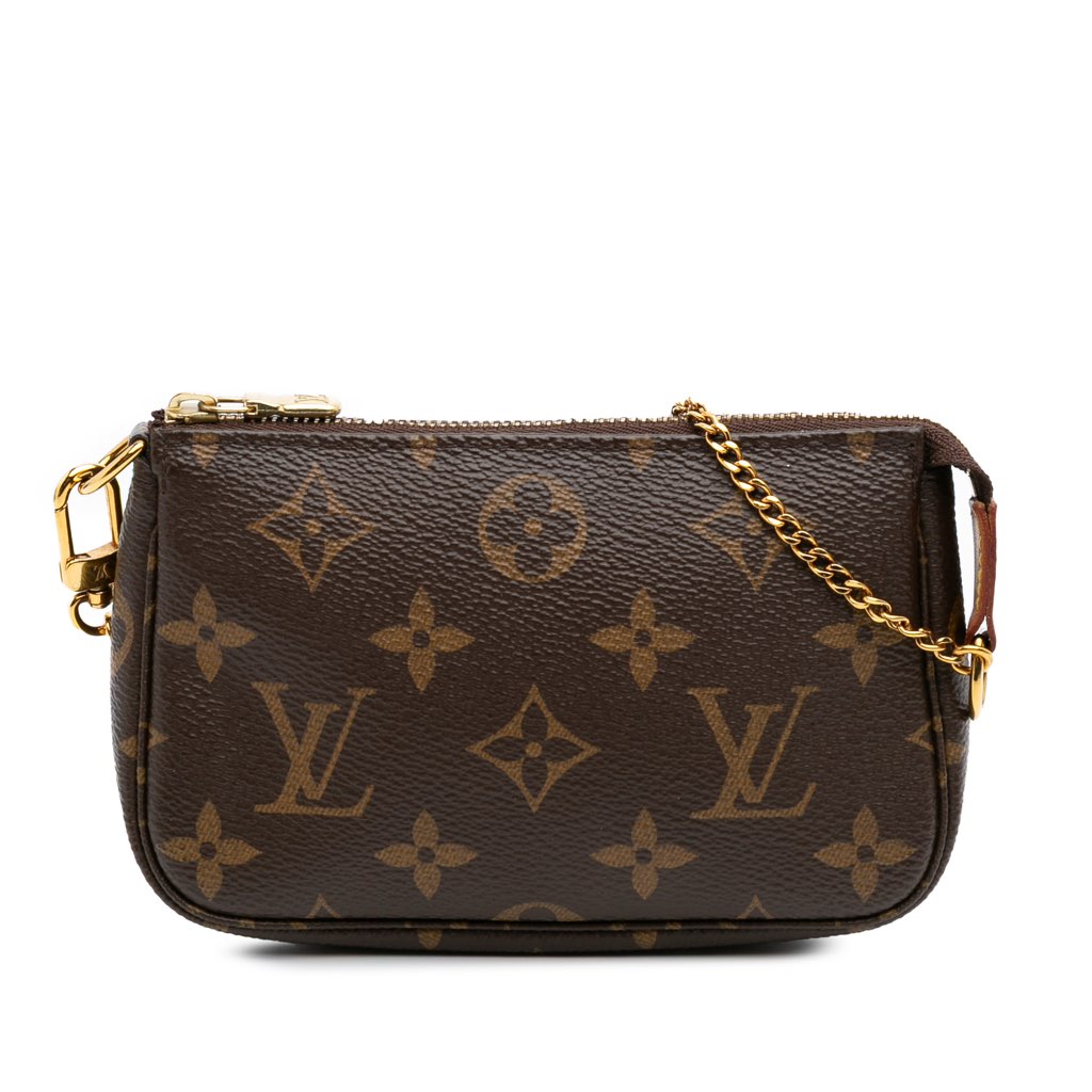 The Mini Pochette Accessoires features a monogram canvas body, a chain link strap, and a top zip closure.