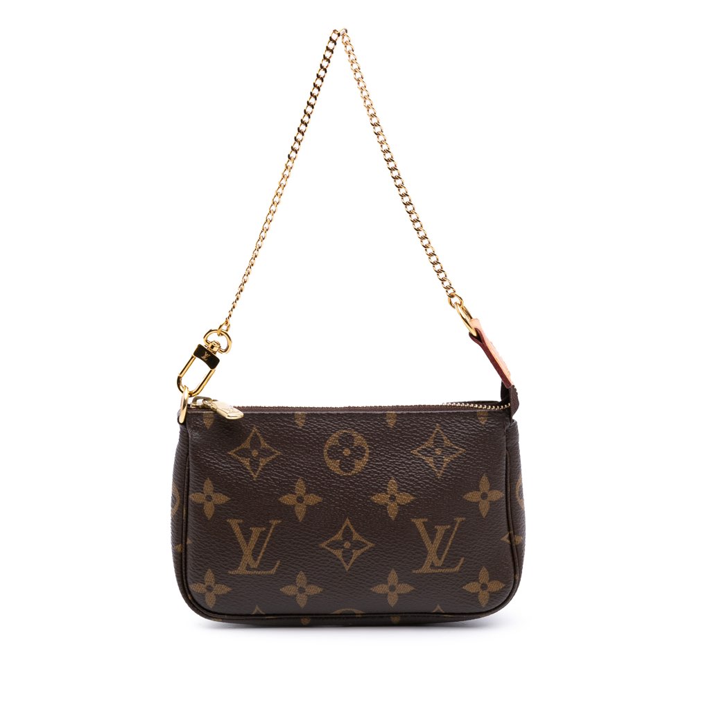 The Mini Pochette Accessoires features a monogram canvas body, a chain link handle, and a top zip closure.