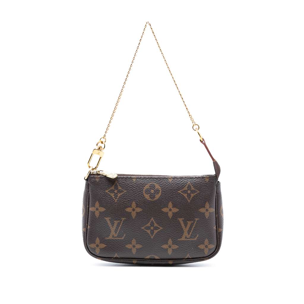 The Mini Pochette Accessoires features a monogram canvas body, a chain link strap, and a top zip closure.