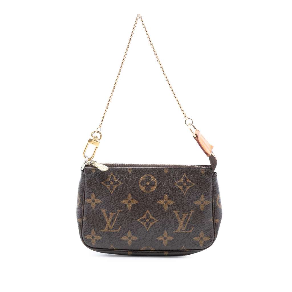 The Mini Pochette Accessoires features a monogram canvas body, a gold-tone chain strap, and a top zip closure.