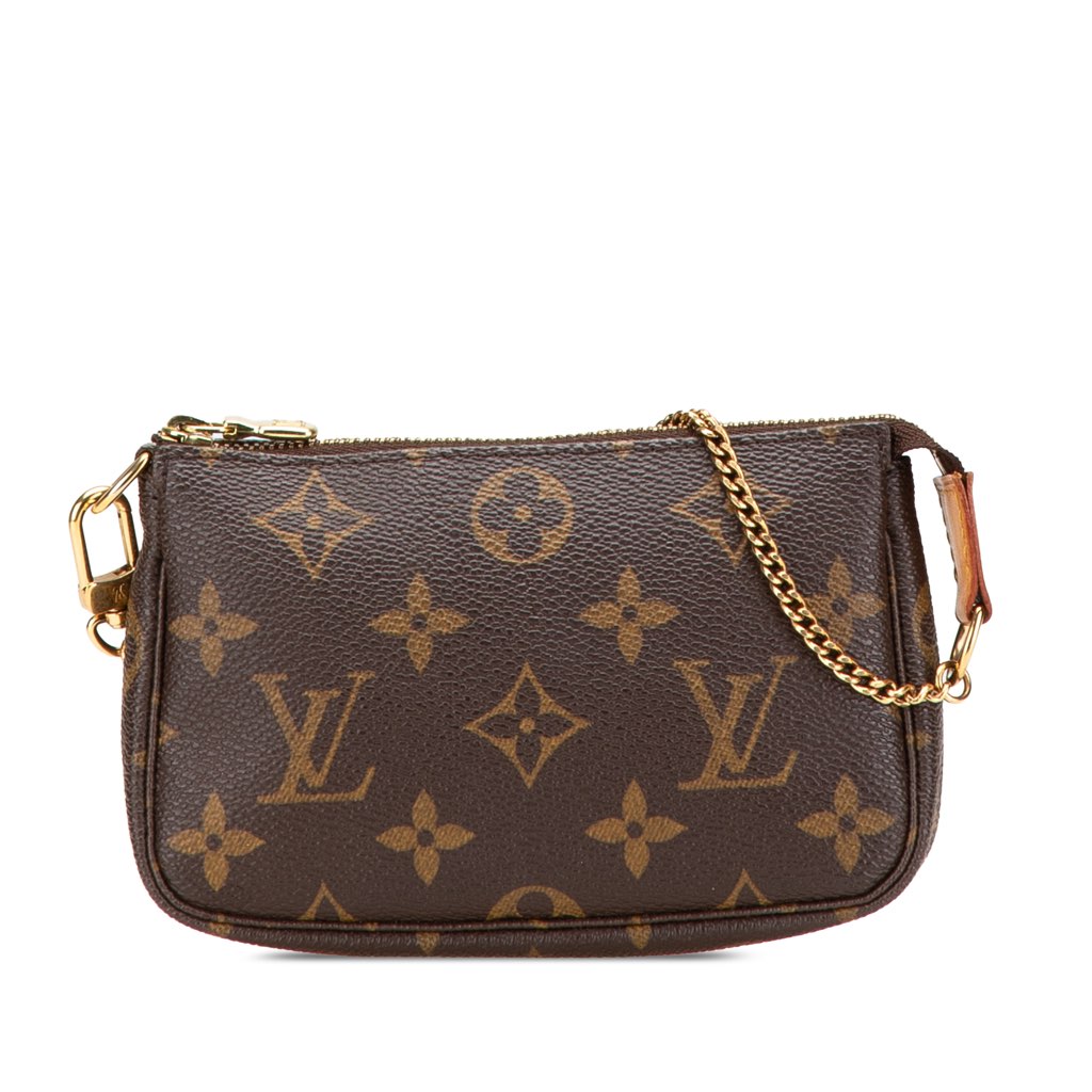 The Mini Pochette Accessoires features a monogram canvas body, a chain link handle, and a top zip closure.