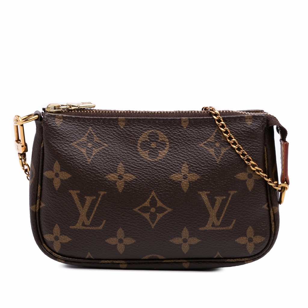 The Mini Pochette Accessoires features a monogram canvas body, a chain link handle, and a top zip closure.