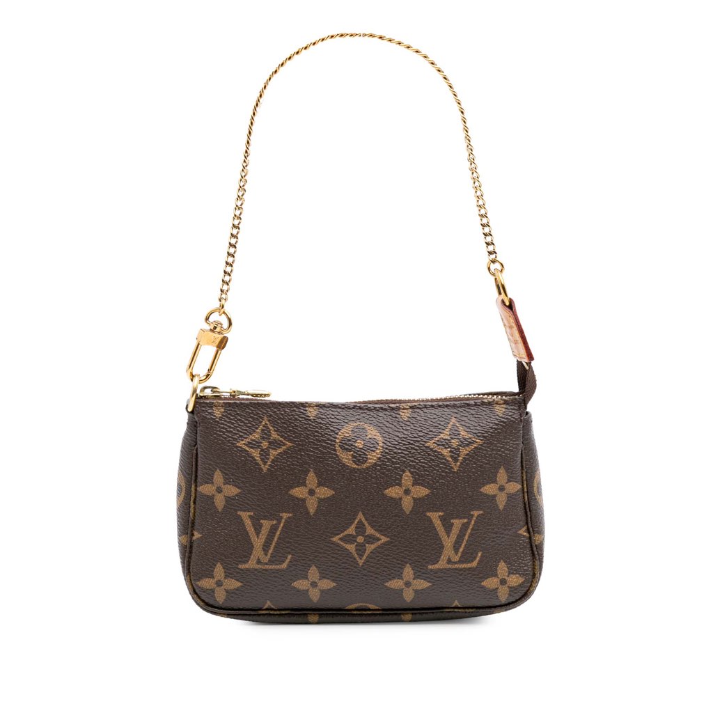 The Mini Pochette Accessoires features a monogram canvas body, a gold-tone chain strap, and a top zip closure.