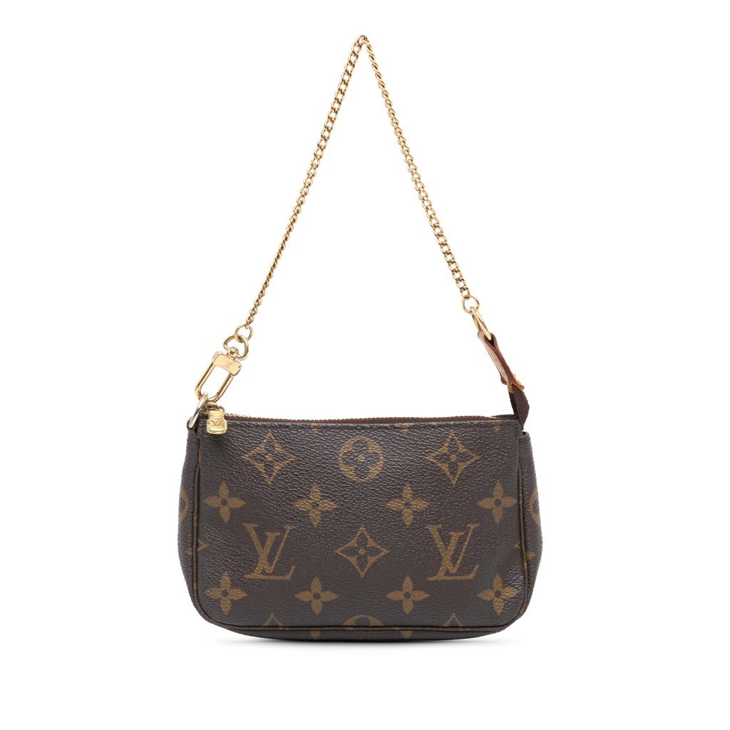 The Mini Pochette Accessoires features a monogram canvas body, a gold-tone chain strap, and a top zip closure.