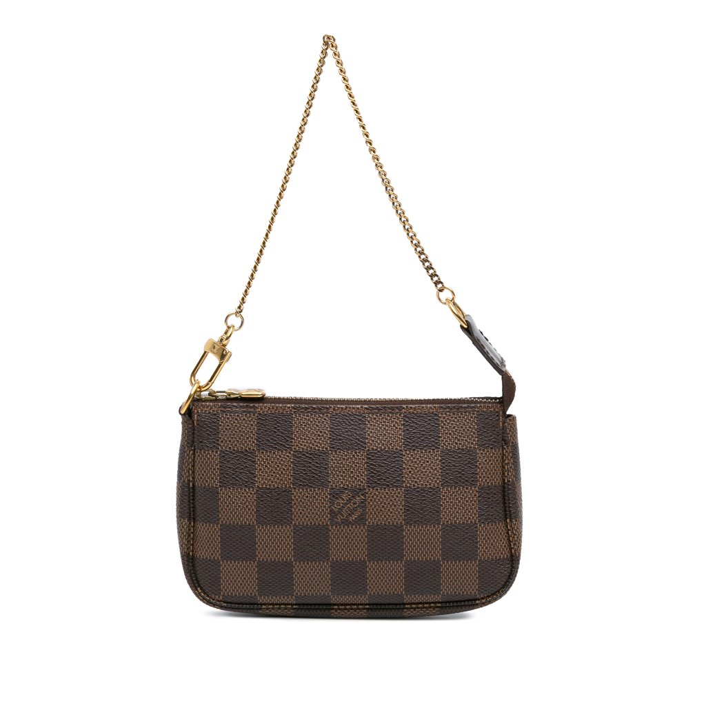 The Mini Pochette Accessoires features a monogram canvas body, a gold-tone chain strap, and a top zip closure.