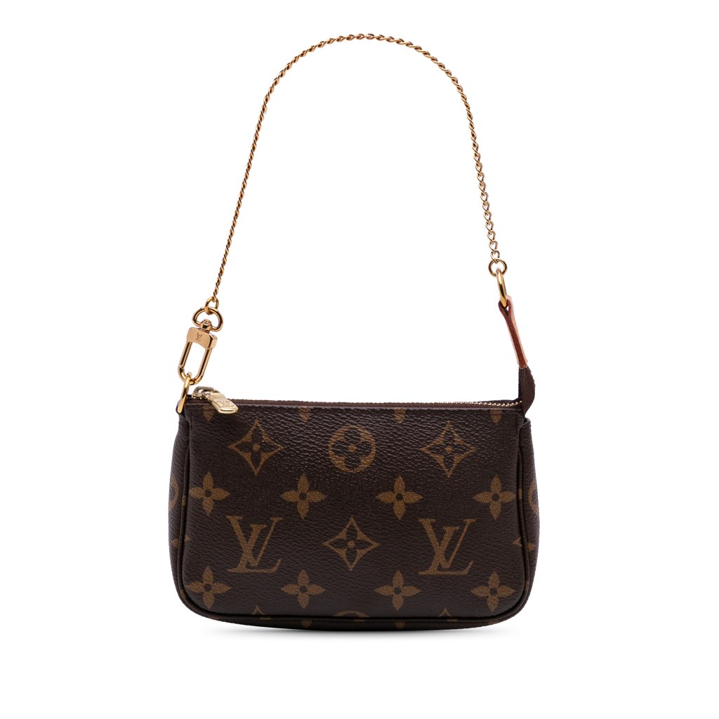 The Mini Pochette Accessoires features a monogram canvas body, a gold-tone chain strap, and a top zip closure.