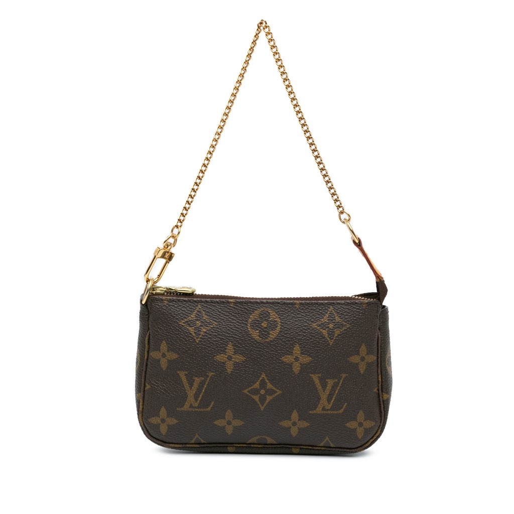 The Mini Pochette Accessoires features a monogram canvas body, a gold-tone chain link strap, and a top zip closure.