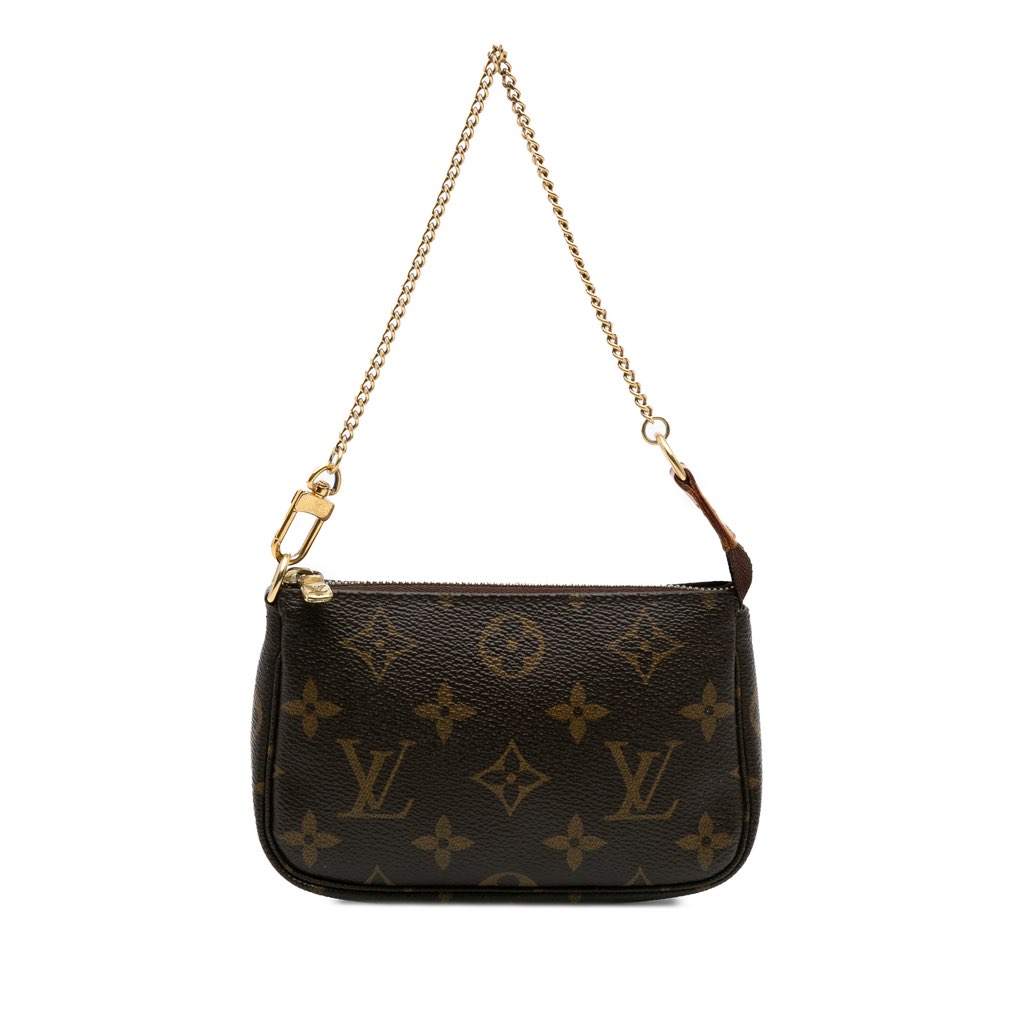 The Mini Pochette Accessoires features a monogram canvas body, a chain link handle, and a top zip closure.