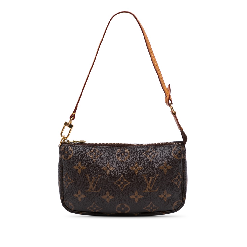The Mini Pochette Accessoires features a monogram canvas body, a flat vachetta leather handle, and a top zip closure.