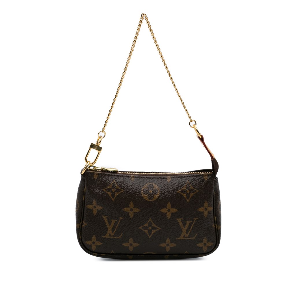 The Mini Pochette Accessoires features a monogram canvas body, a chain link handle, and a top zip closure.