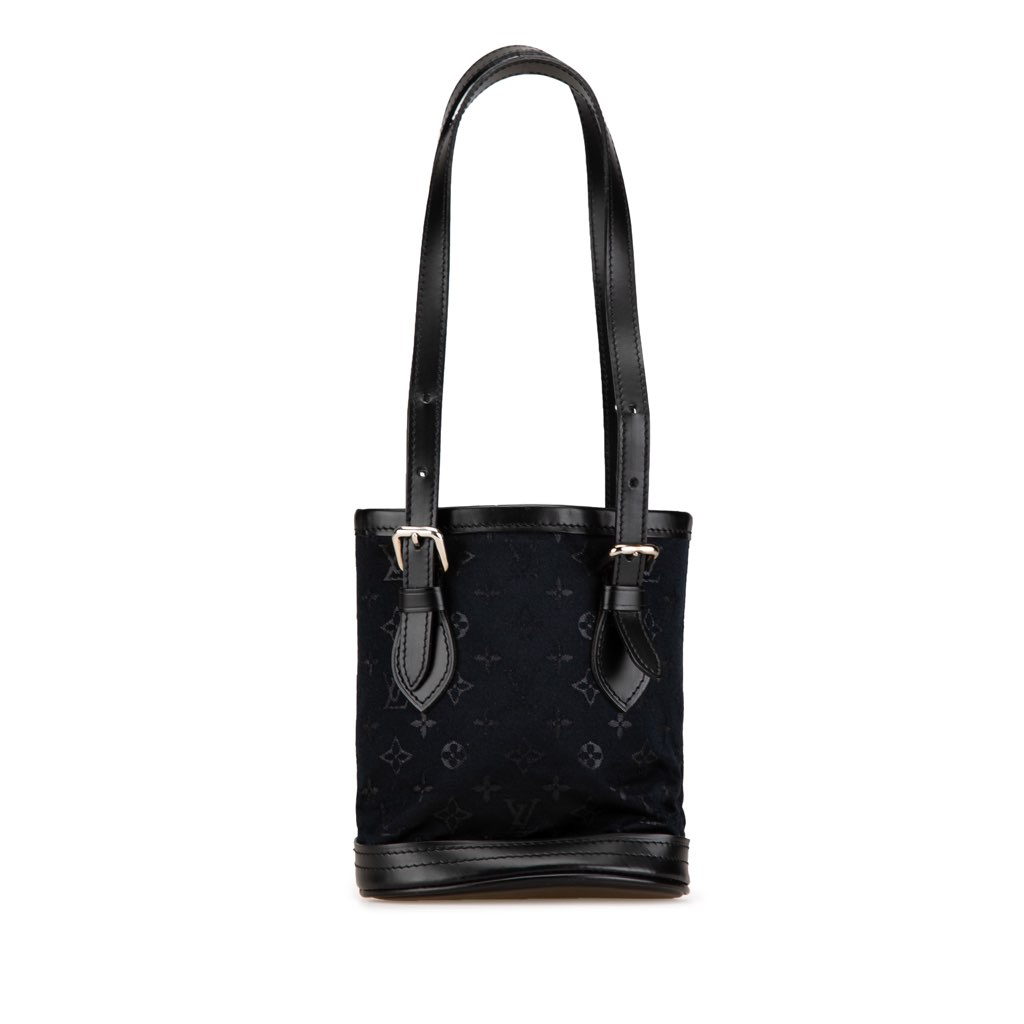 This bucket bag features a monogram satin body with leather trim, flat leather straps, and an open top.