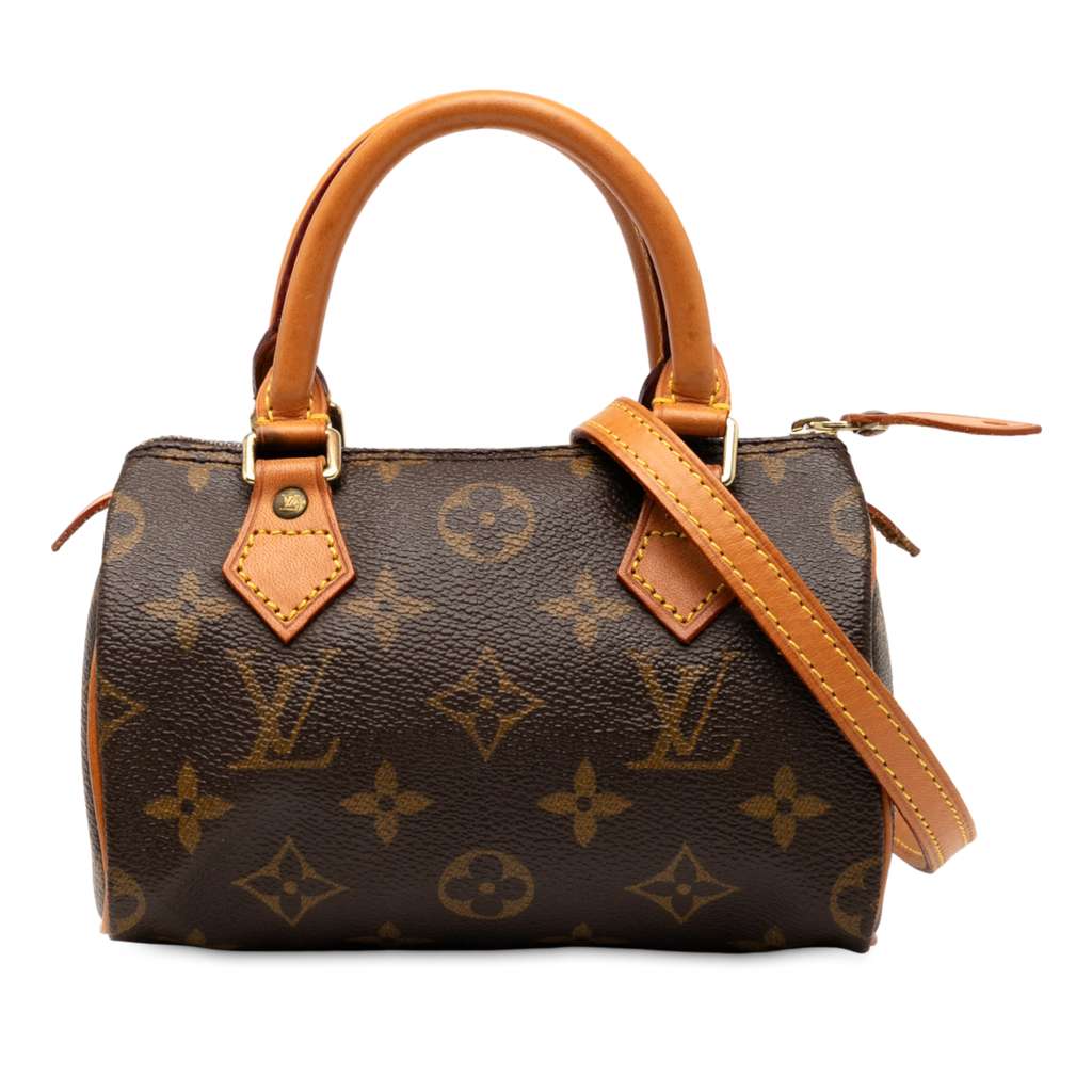 The Mini Speedy features a monogram canvas body with vachetta leather trim, rolled vachetta leather handles, a detachable vachetta leather strap, and a top zip closure.