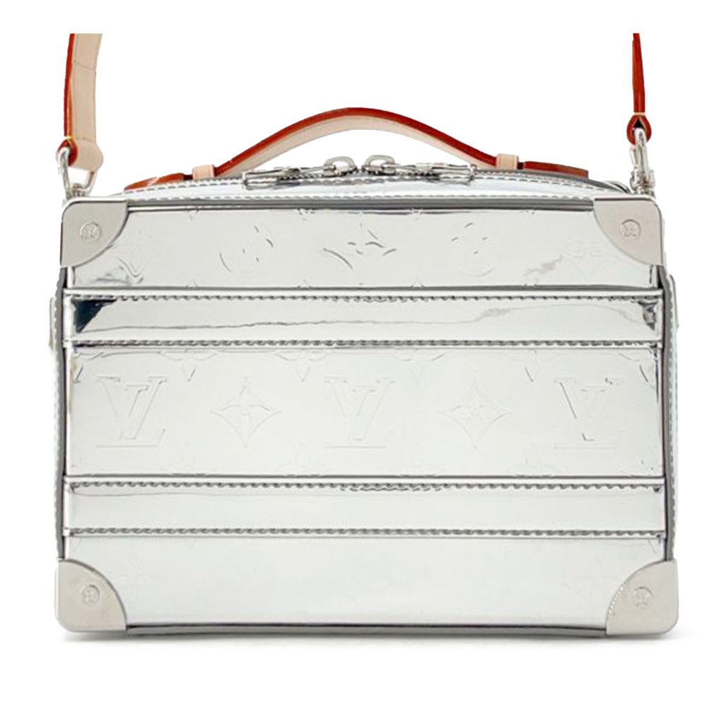 The Soft Trunk features a monogram miroir body, a vachetta leather top handle, an adjustable flat vachetta leather strap, a zip around closure, and an interior slip pocket.