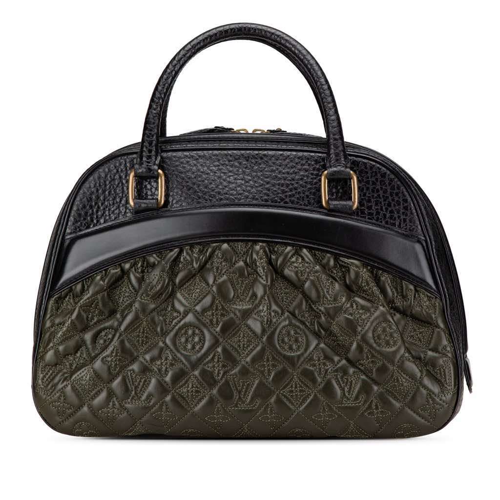 The Mizi Vienna features a monogram quilted lambskin body with leather trim, rolled leather handles, a top zip closure, an exterior open pocket, and interior slip pockets.