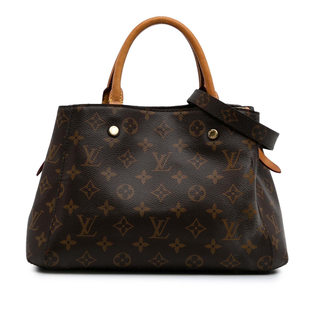The Montaigne BB features a coated canvas body, rolled vachetta leather handles, a detachable flat strap, an open top with lobster claw clasp closure, and interior slip and zip pockets. Exterior edges are repainted.
