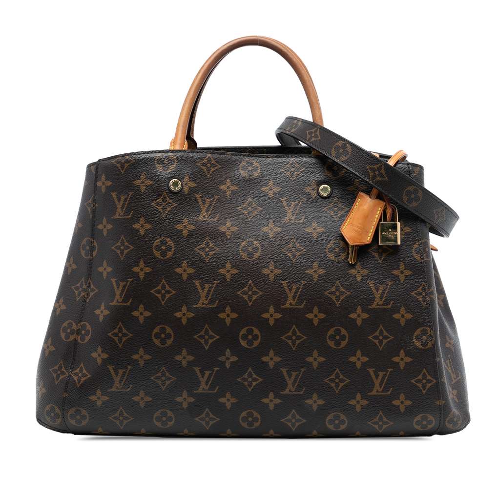 The Montaigne GM features a monogram canvas body, rolled vachetta leather handles, a detachable flat strap, an open top with lobster clasp closure, interior zip and slip compartments, and an interior slip pocket.
