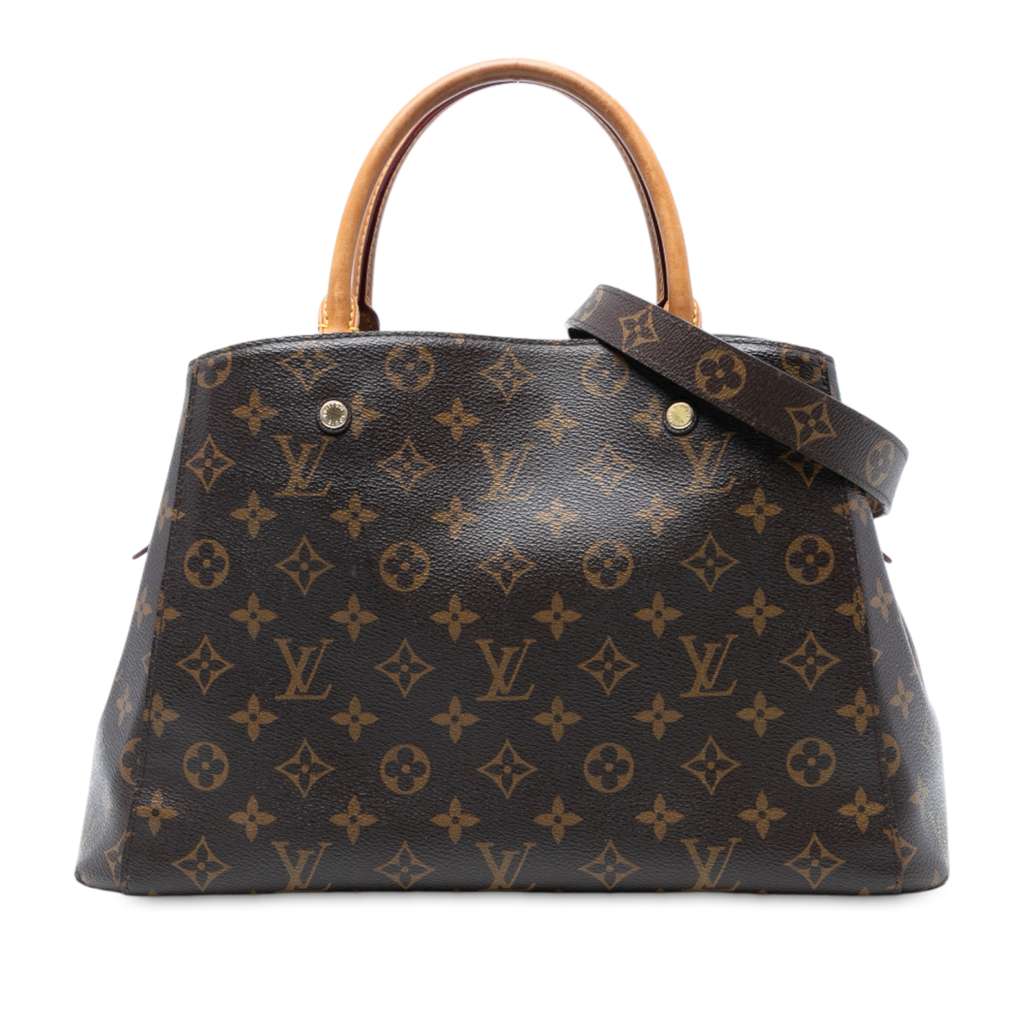 The Montaigne MM features a monogram canvas body, rolled vachetta leather handles, a detachable strap, a top clasp closure, and interior slip and zip pockets.
