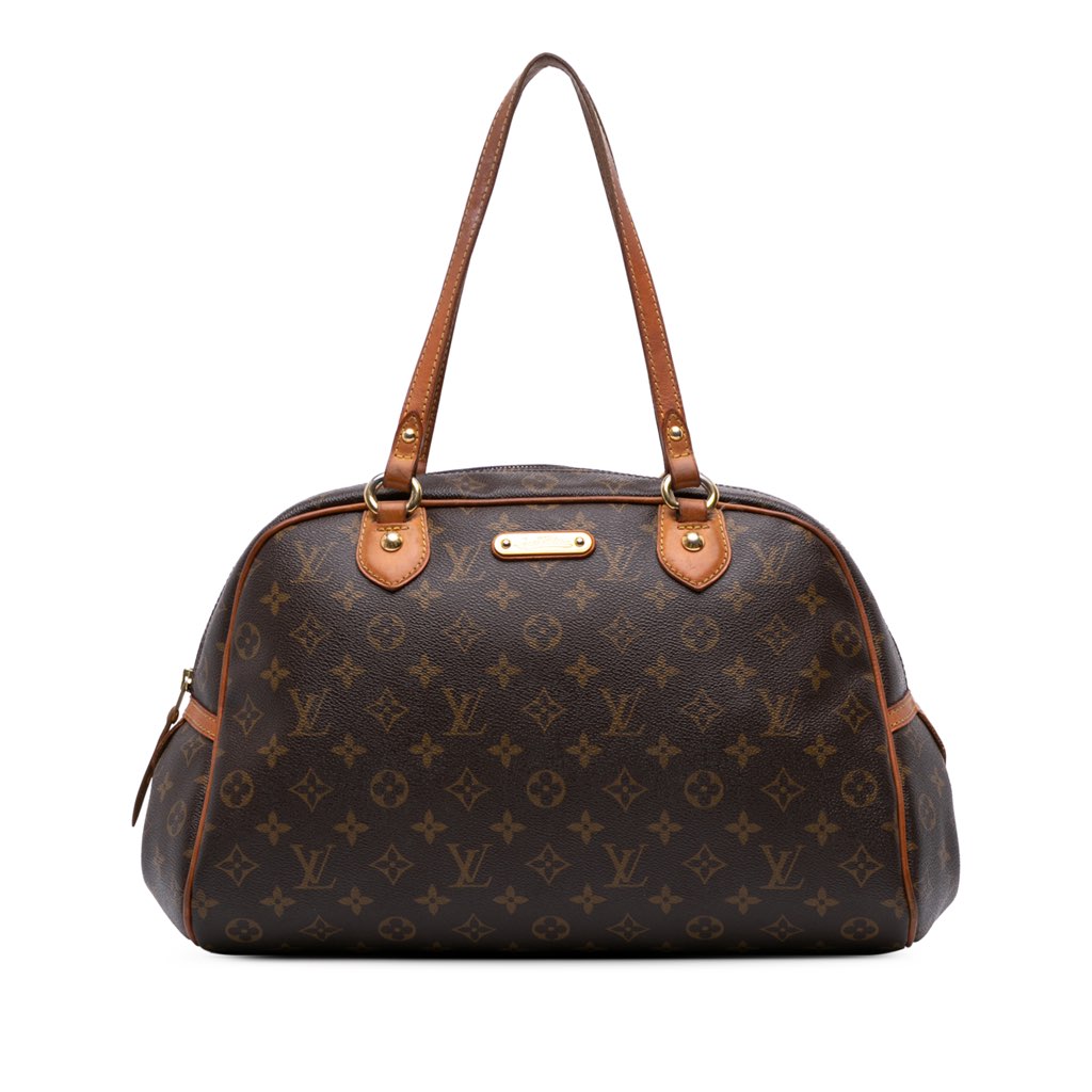 The Montorgueil features a monogram canvas body, flat vachetta handles, a top zip closure, and an interior slip pocket.