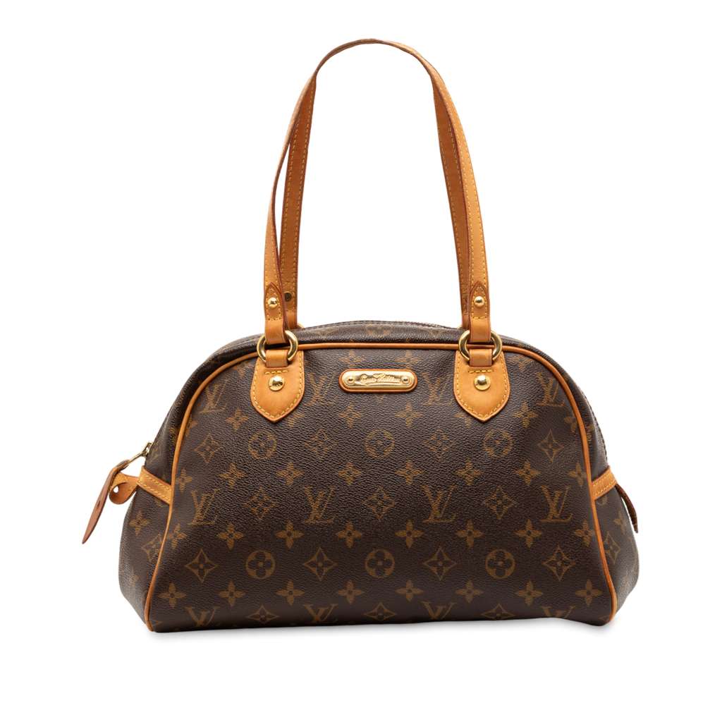 The Montorgueil PM features a monogram canvas body with vachetta leather trim, flat vachetta leather handles, a top zip closure, and an interior slip pocket.